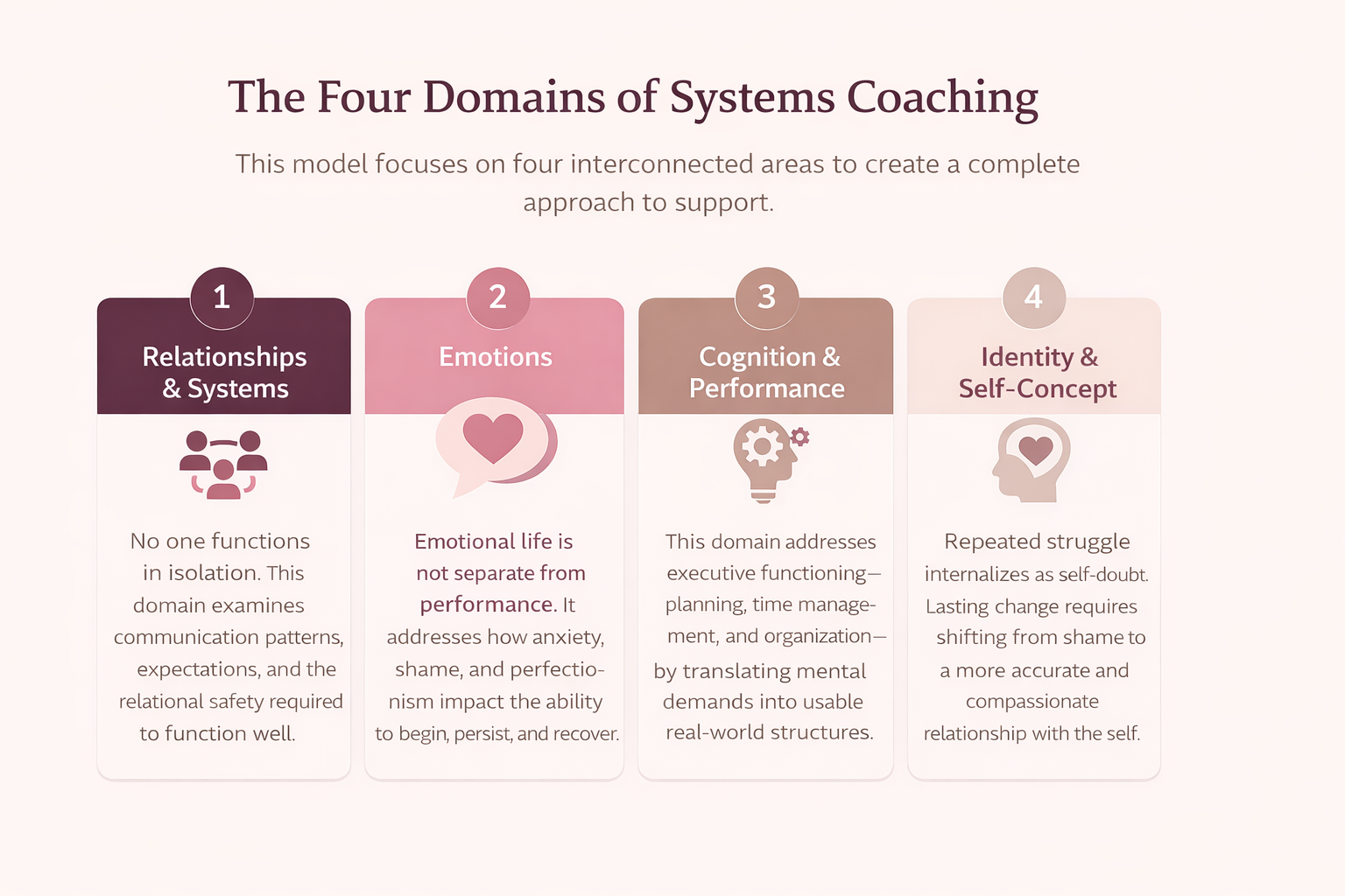 Systems Coaching is a holistic model for improving how people function in real life. It moves beyond simply addressing symptoms or expecting individuals to "try harder" within broken patterns. Instead, it looks at the full picture—the conditions and environments that shape how a person learns, works, and manages emotion.